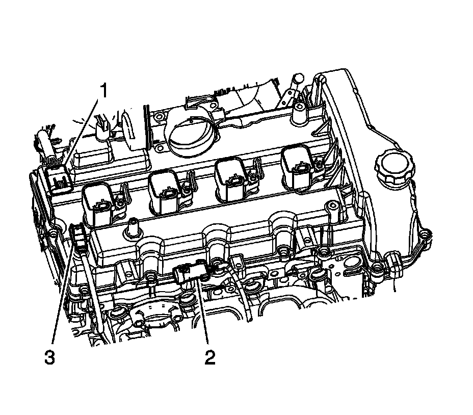 6. Disconnect the engine wiring harness retainer (2) from the camshaft cover (3).