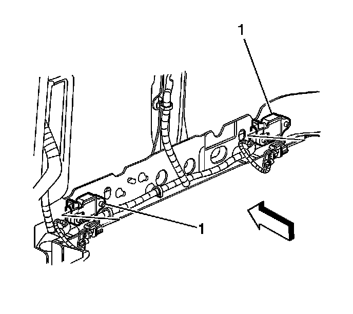 3. Loosen the fasteners (1) retaining the front discriminating sensors to the radiator support.