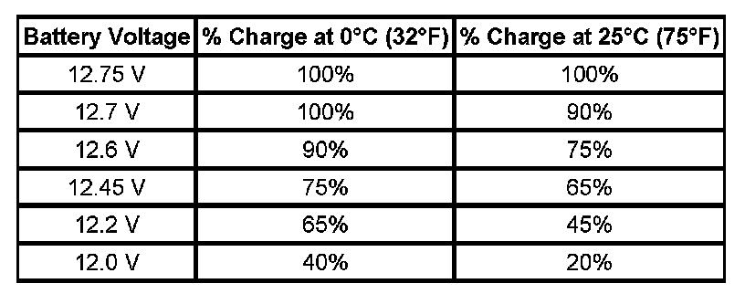 Important: Using voltage to determine the batteries state of charge (SOC) is only accurate after the battery has been at rest for 24 hours. This is enough time for the acid in each cell to equalize. If the battery has been charged or discharged in the past 24 hours, the battery SOC will only be an estimate.
