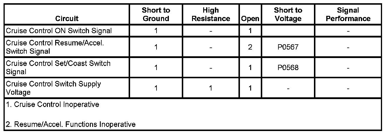 ^ If the Cruise Control Resume/Accel. Switch parameter displays On, test the cruise control resume/accel. switch signal circuit for a short to voltage. If the circuit tests normal, replace the ECM.