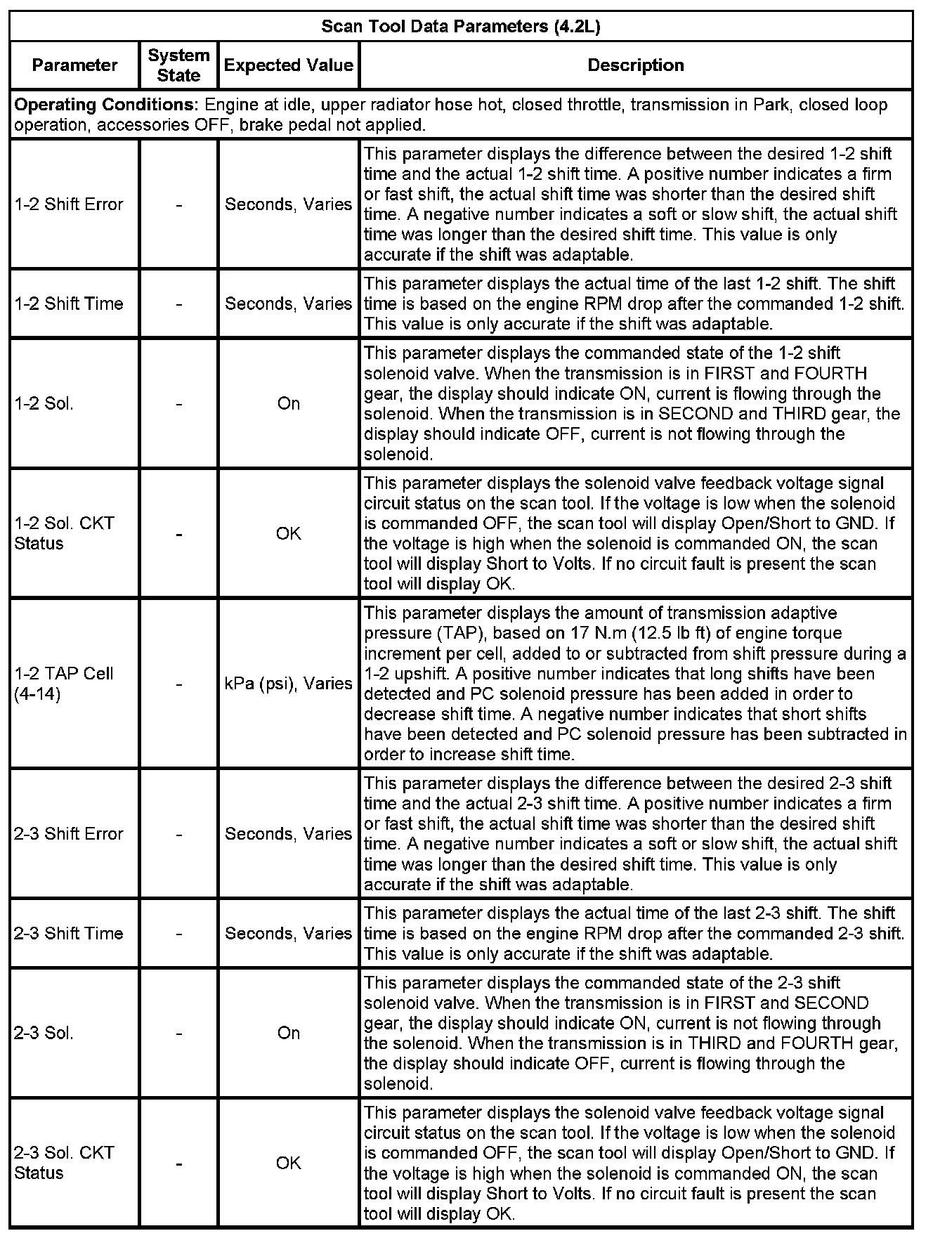 The scan tool values from a properly functioning transmission may be used for comparison with the transmission you are diagnosing. The values below represent a typical display recorded from a properly functioning system.