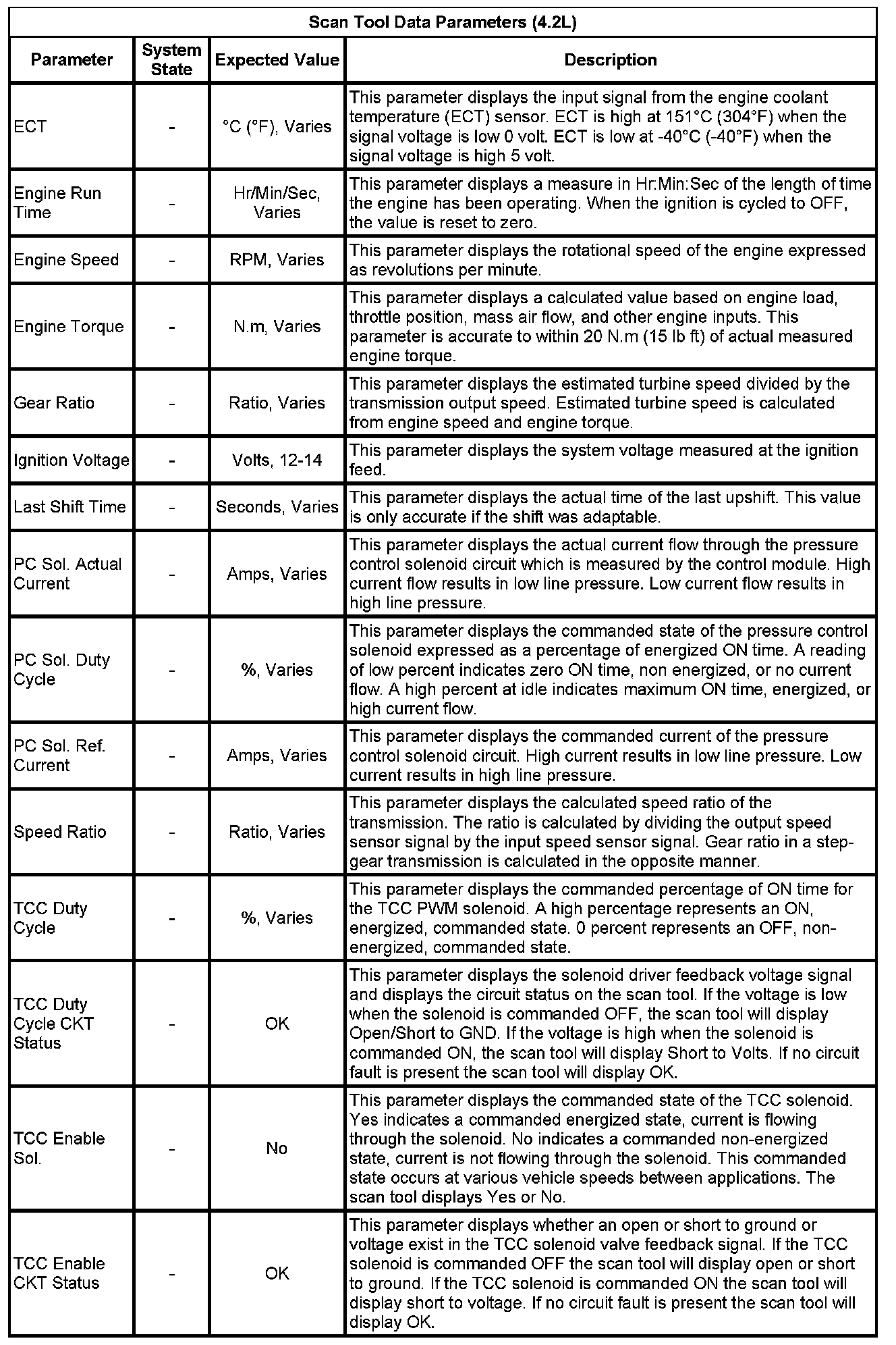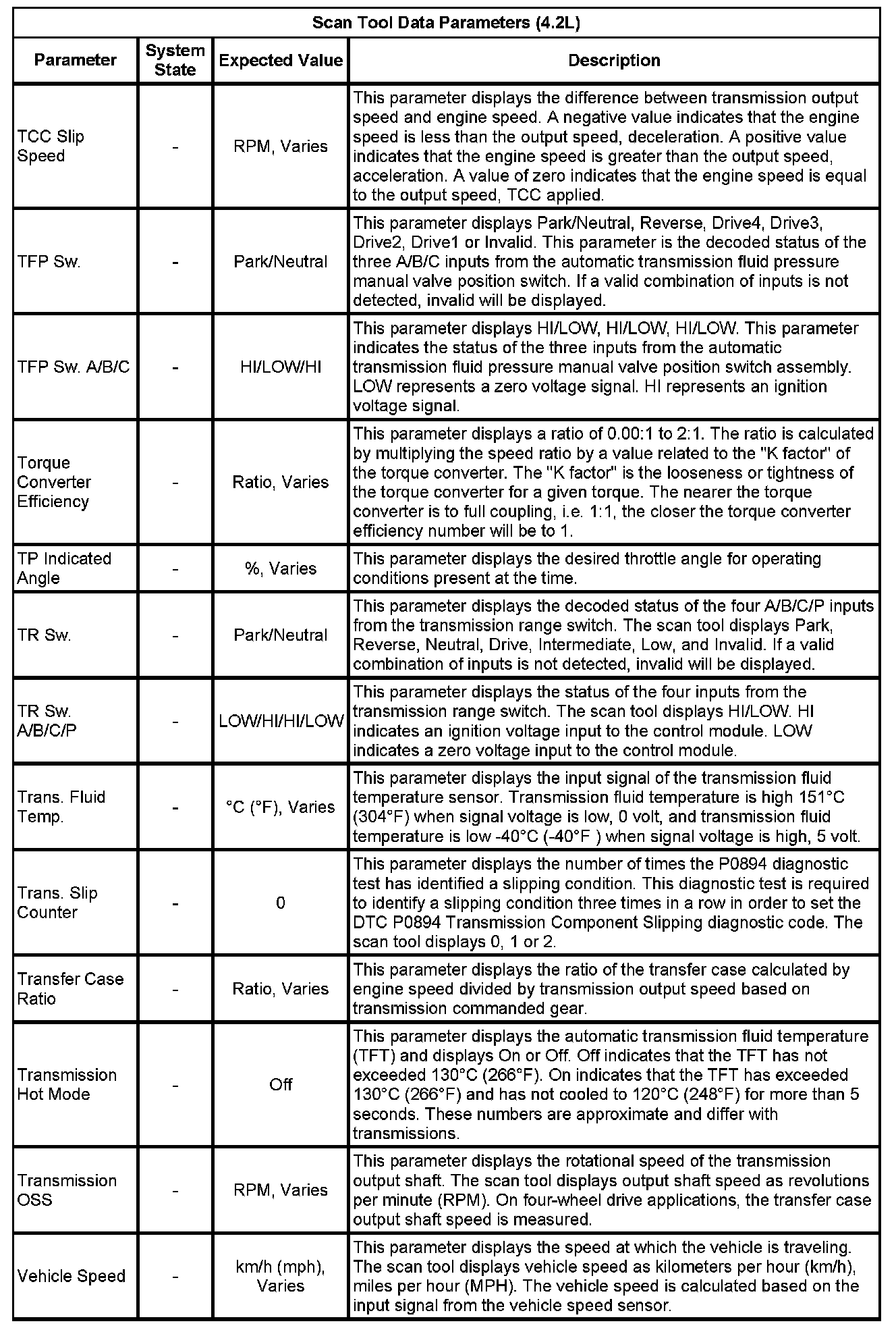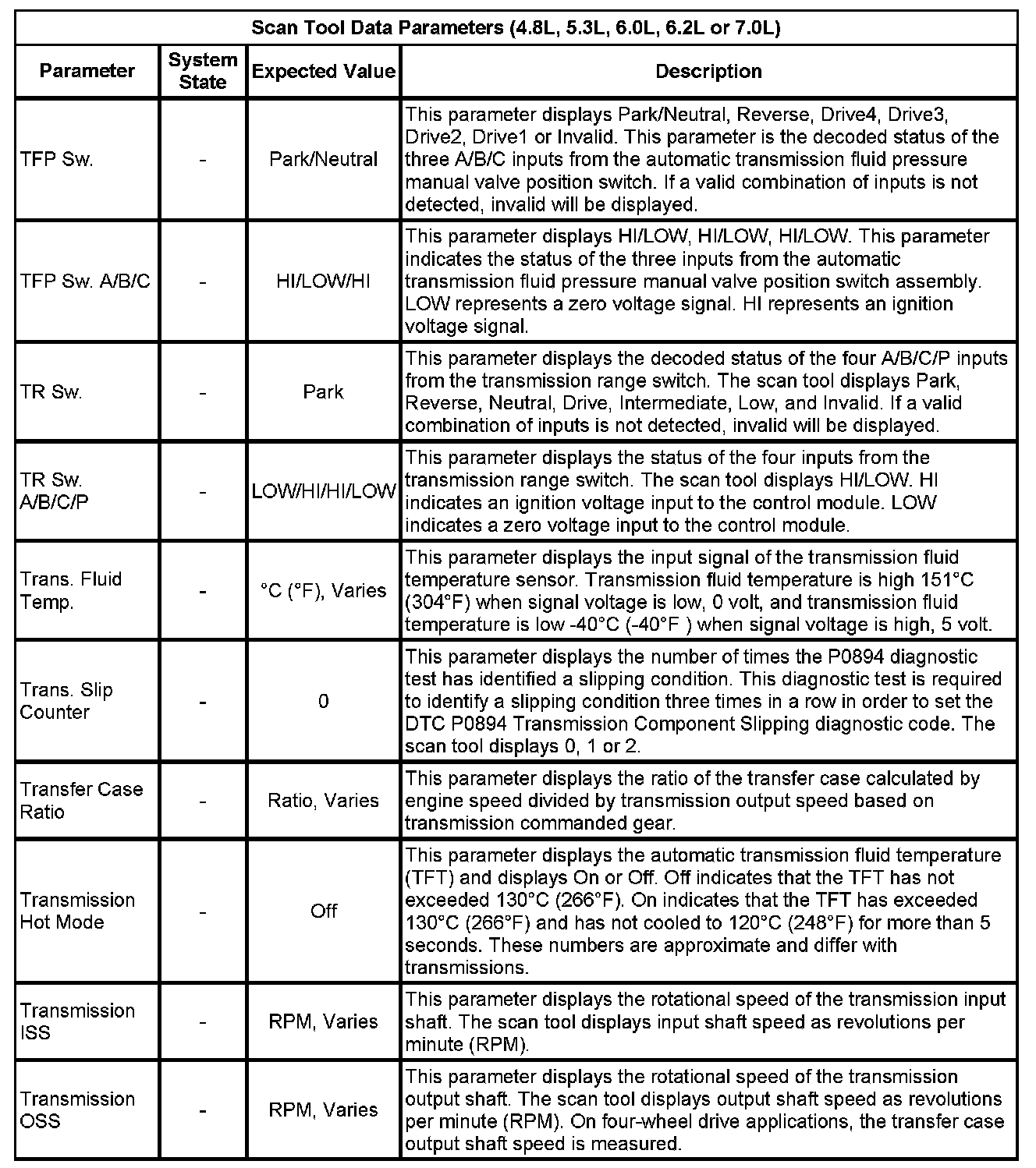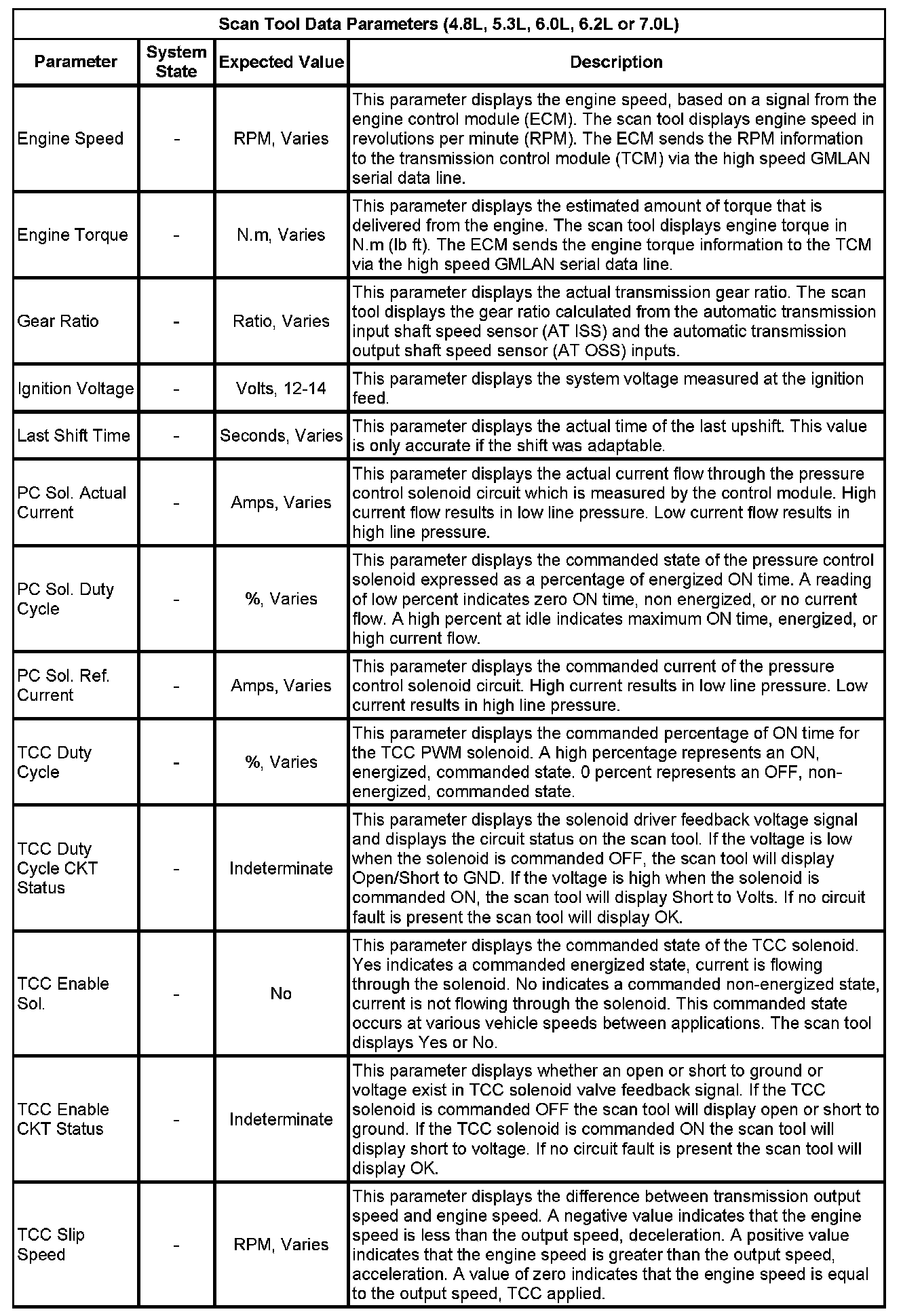 The Transmission Control Module Scan Tool Data List contains all transmission related parameters that are available on the scan tool. The list is arranged in alphabetical order. A given parameter may appear in any one of the data lists, and in some cases may appear more than once, or in more than one data list in order to group certain related parameters together.