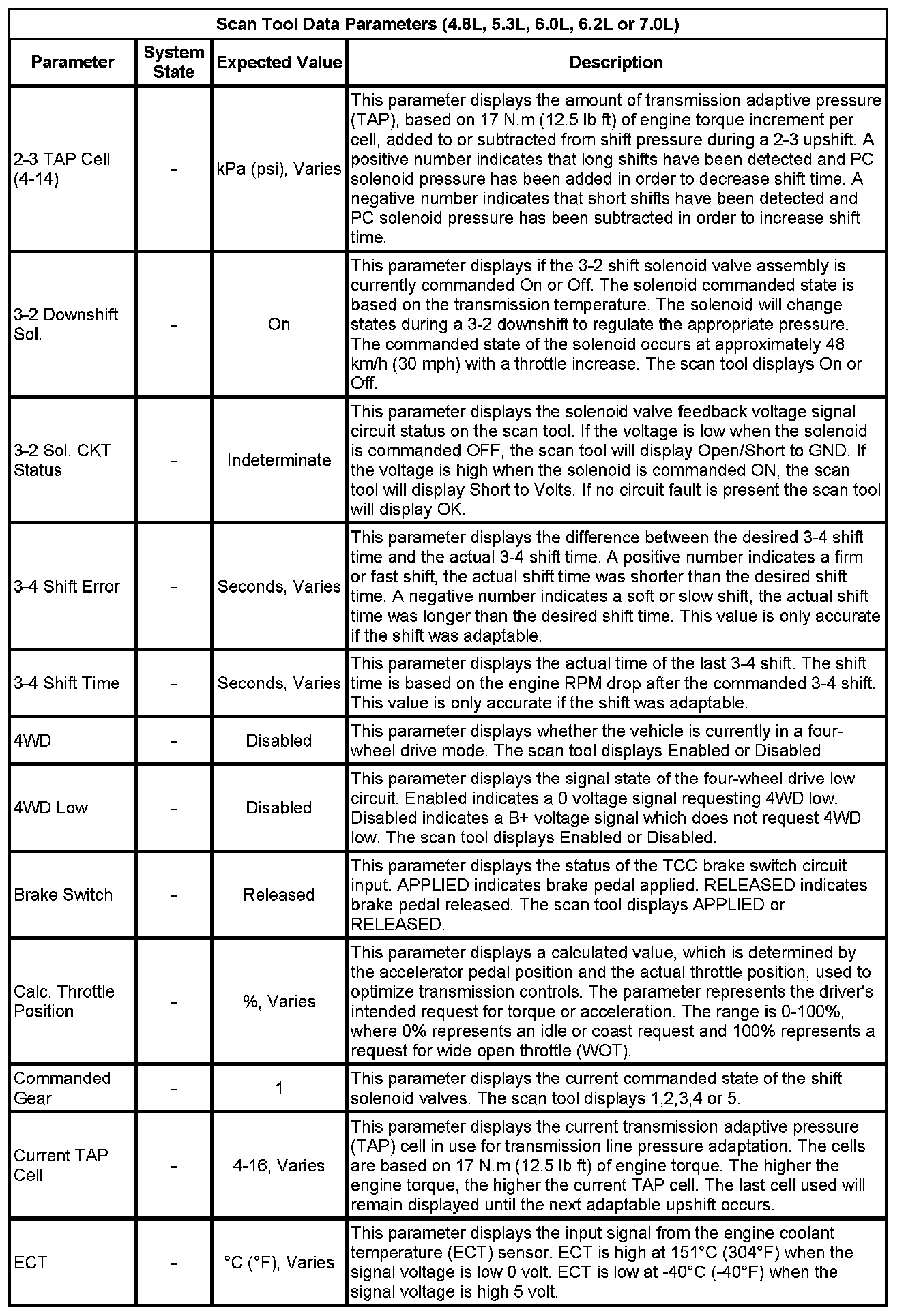 Only the parameters listed below are used/referenced in this manual for diagnosis. If a scan tool displays other parameters, those values are not recommended by General Motors for use in diagnosis.