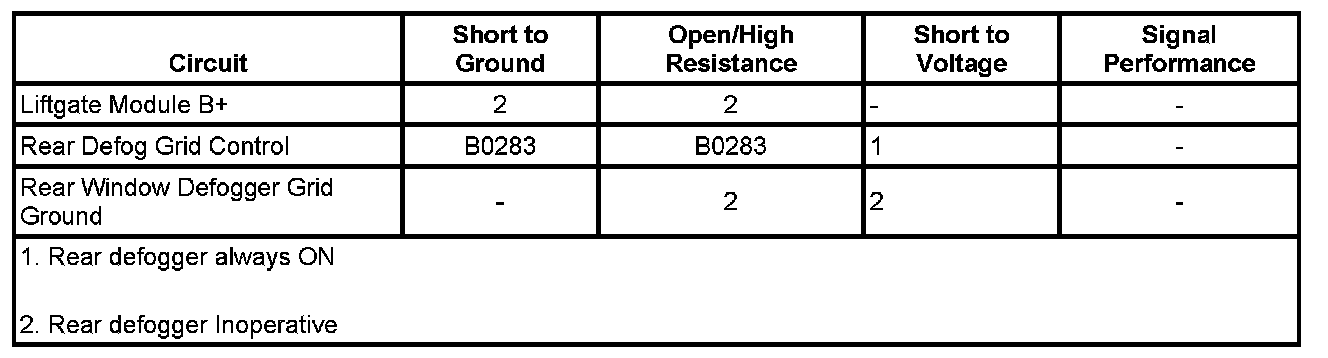 ^ If the test lamp is always OFF, test the rear defog element supply voltage circuit for a short to ground or an open/high resistance. If the circuit tests normal, replace the LGM.