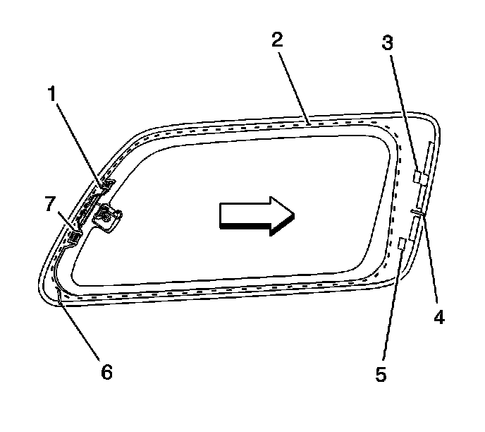 8. From the exterior of the vehicle, wearing safety gloves and goggles, pull the body side window outward and forward until the front body side window hinge releases from the window frame (2). Discard the body side window.