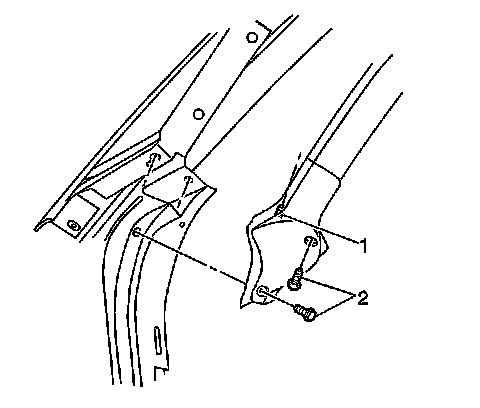 Important: The windshield lower supports (1) have molded in locks with an adhesive strip (2) on the back side. If the windshield lower stops have been removed, they must be replaced.
