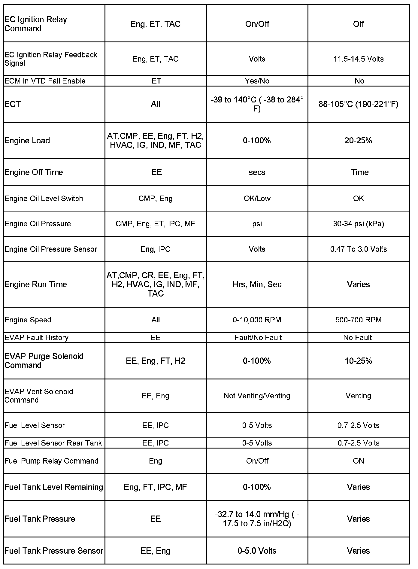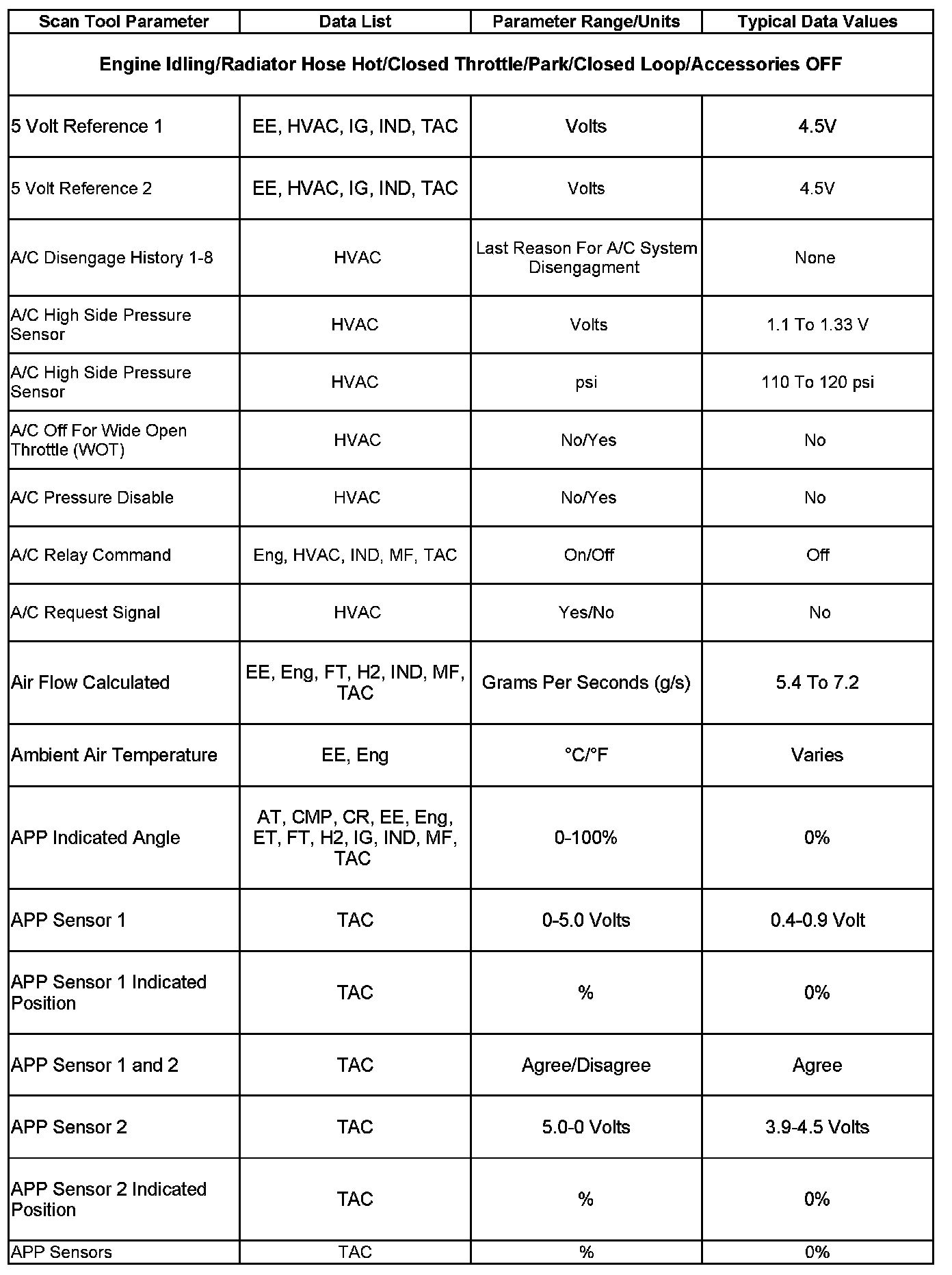 Scan Tool Data ListThe Engine Scan Tool Data List contains all engine related parameters that are available on the scan tool. The list is arranged in alphabetical order. A given parameter may appear in any one of the data lists, and in some cases may appear more than once, or in more than one data list in order to group certain related parameters together.