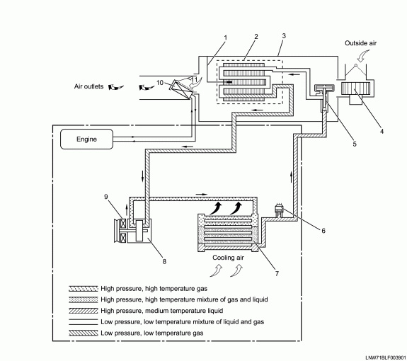 The condenser forces the high temperature and high pressure refrigerant gas supplied from the compressor to cool down and liquefy via the condenser by outside air. Jamming of the condenser of blockage of air flow into the condenser's cooling fin may result in insufficient cooling capacity, increase the pressure of the refrigerant cycle and increase the load on the engine. When the condenser is functioning properly, the refrigerant discharge line of the condenser is usually colder than that of the intake line.