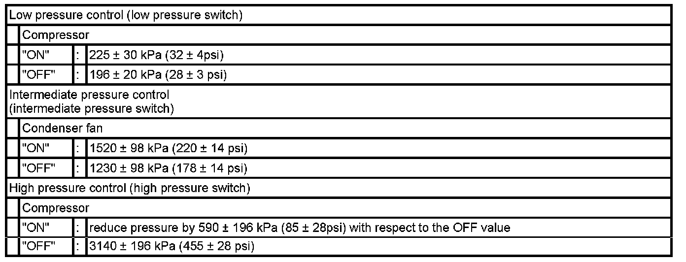 The pressure switch (triple pressure switch) is installed on the high pressure pipe, and is used to detect unusually high refrigerant pressure (high pressure switch) and prevent compressor seizing (low pressure switch) due to refrigerant leakage by turning the magnetic clutch to "ON" or "OFF" at the preset pressure. A cycling switch is also available, which is used for the "ON" and "OFF" control (intermediate pressure switch) of the condenser fan.