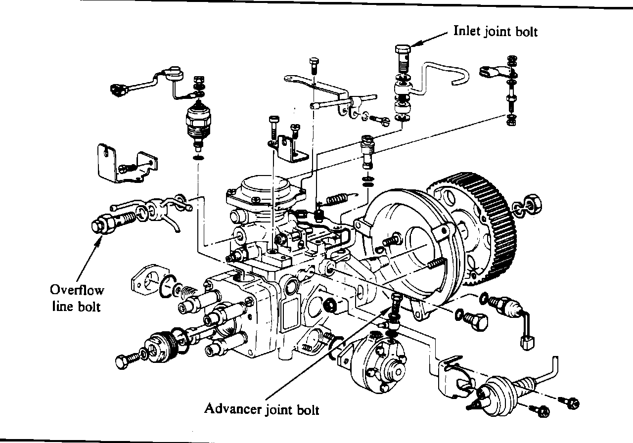 The inlet fuel line joint bolt and the overflow line bolt on the diesel engine injection pump have built-in filter screens. If these screens become partially plugged, the engine will gradually lose power.