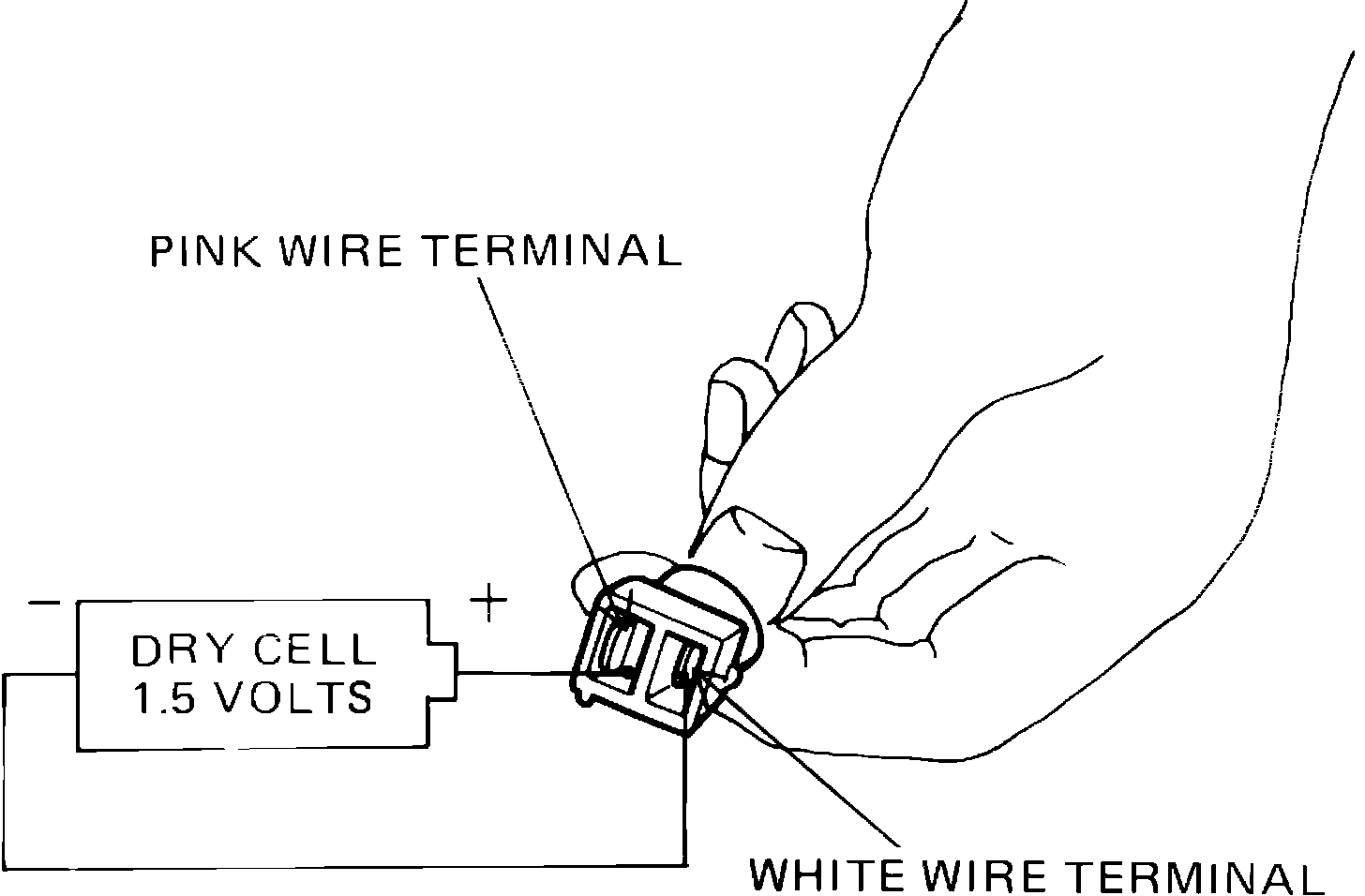 a. Disconnect distributor electrical connector, then using a 1.5 volt dry cell battery connect to the terminal as shown in Fig. 2 Do not apply voltage more than 5 seconds to prevent damage of power transistor in igniter.