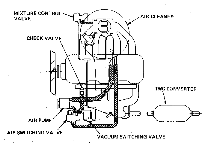 The air injection reactor system, Fig. 14 is designed so ambient air is pressurized by the air pump and is then injected, through the injection nozzles provided near each exhaust valve, into the exhaust gasses. The exhaust gasses are high in temperature and self-ignite when brought into contact with the oxygen of the ambient air.