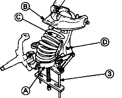 d. Set plate to lower link A using alignment hole in guide link plate 4. Install a suitable chain through one coil nearest top of spring and connect other end to the upper control arm to prevent spring from coming out.