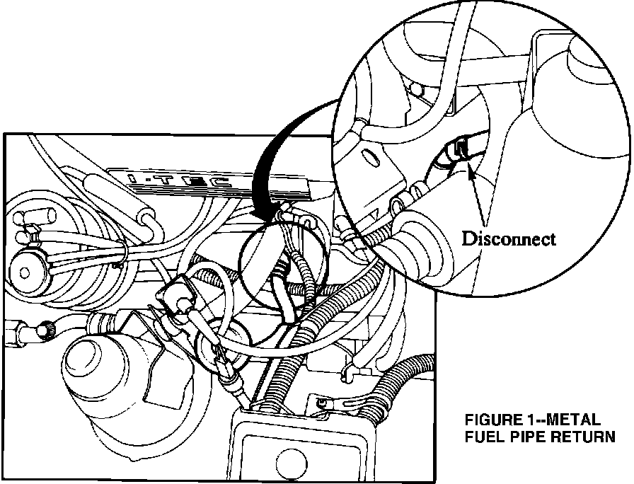 3. Working within the engine compartment, separate the metal fuel return pipe from the hose leading to the pressure regulator (Figure 1). Unbolt the bracket holding this pipe (about 4 inches from the open end of the pipe).