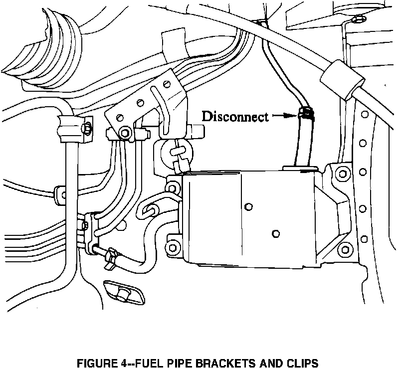 5. Remove all visible fuel pipe brackets and clips. Brackets are bolted to the body (Figure 3) and may be all metal or a metal/rubber combination. Clips are held in place by the pipes themselves. Some brackets may not be visible until other components are removed