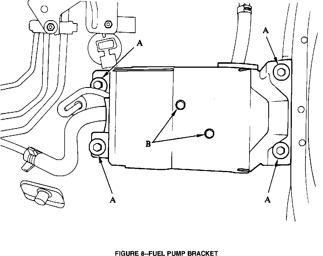 13. Remove the 4 bolts holding the fuel pump bracket to the vehicle (A, Figure 8). Remove the 2 bolts securing the pump to the bracket (B, Figure 8). Temporarily wire the pump to the chassis so it doesn't hang by its electrical harness.
