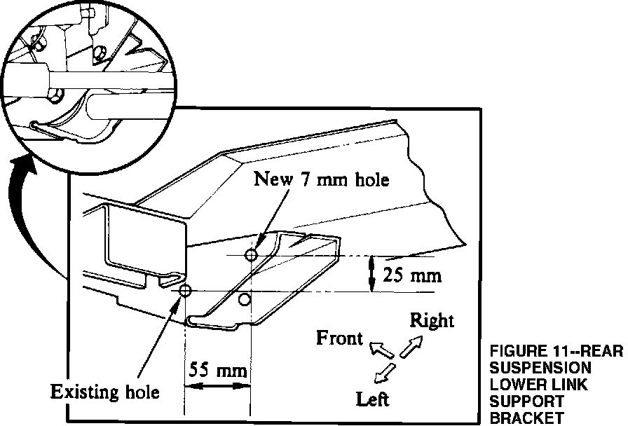 19. Drill a 7 mm hole in the rear suspension lower link support bracket; see Figure 11 for hole placement. Apply primer paint to the new hole.