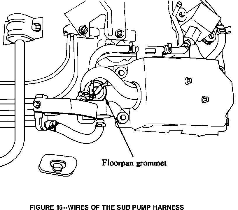 28. Insert the two bare wires of the sub pump wiring harness through the floorpan grommet (Figure 16). To prevent water entry, seal the grommet area with RTV sealant.