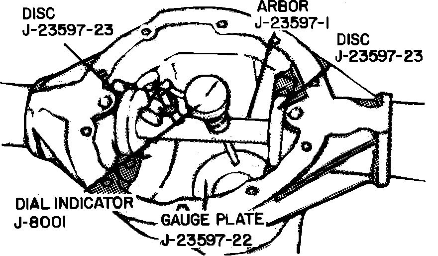 10. Position the gauge shaft assembly in the carrier so that the dial indicator rod is centered on the gauging area of the gauge block and the discs are seated fully in the side bearing bores. Install bearing caps and torque bolts to 45 ft. lbs.