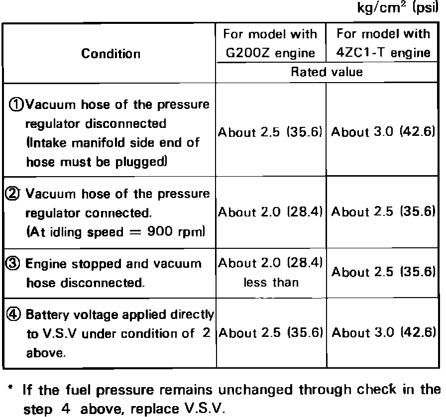 3. Start engine and measure fuel pressure under the four different conditions listed in chart, Fig. 88. If fuel pressure remains unchanged through check in step 4 of chart, replace VSV.