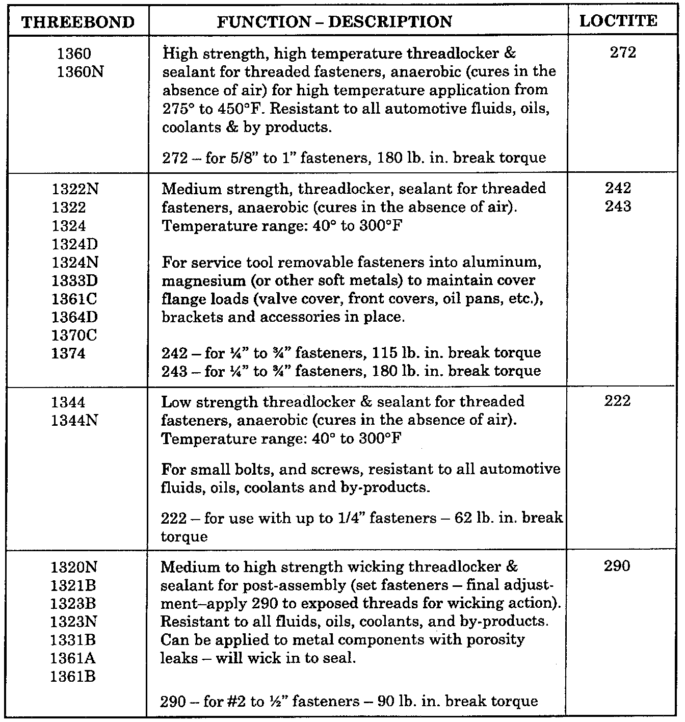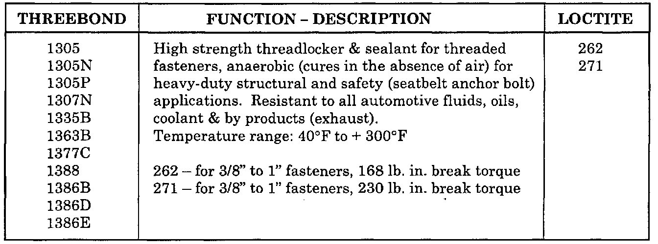 The following is a listing of Loctite/Permatex products cross-referenced with ThreeBond products.