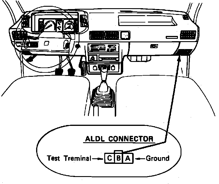 A three terminal connector, located near the ECM connector, is used to actuate the trouble code system within the ECM. This is the ALDL connector (Assembly Line Diagnostic Link) or ALCL connector (Assembly Line Communications Link), Fig. 3. Two terminals of this connector (A and C) are used to activate the trouble code system in the ECM. With the ignition switch turned ON, a jumper wire between terminal A and C will activate the trouble code system. The ``Check Engine'' light will begin to flash a code 12. Code 12 consists of one flash, a short pause, then two flashes. There will be a longer pause and a code 12 will repeat two more times. This check indicates that the self-diagnostic system is operating. The cycle will then repeat itself until the engine is started or the ignition is switched OFF. In most cases, codes will be checked with the engine operating since no codes other than code 12 or 51 will be present on initial key ON (ignition switch ON).