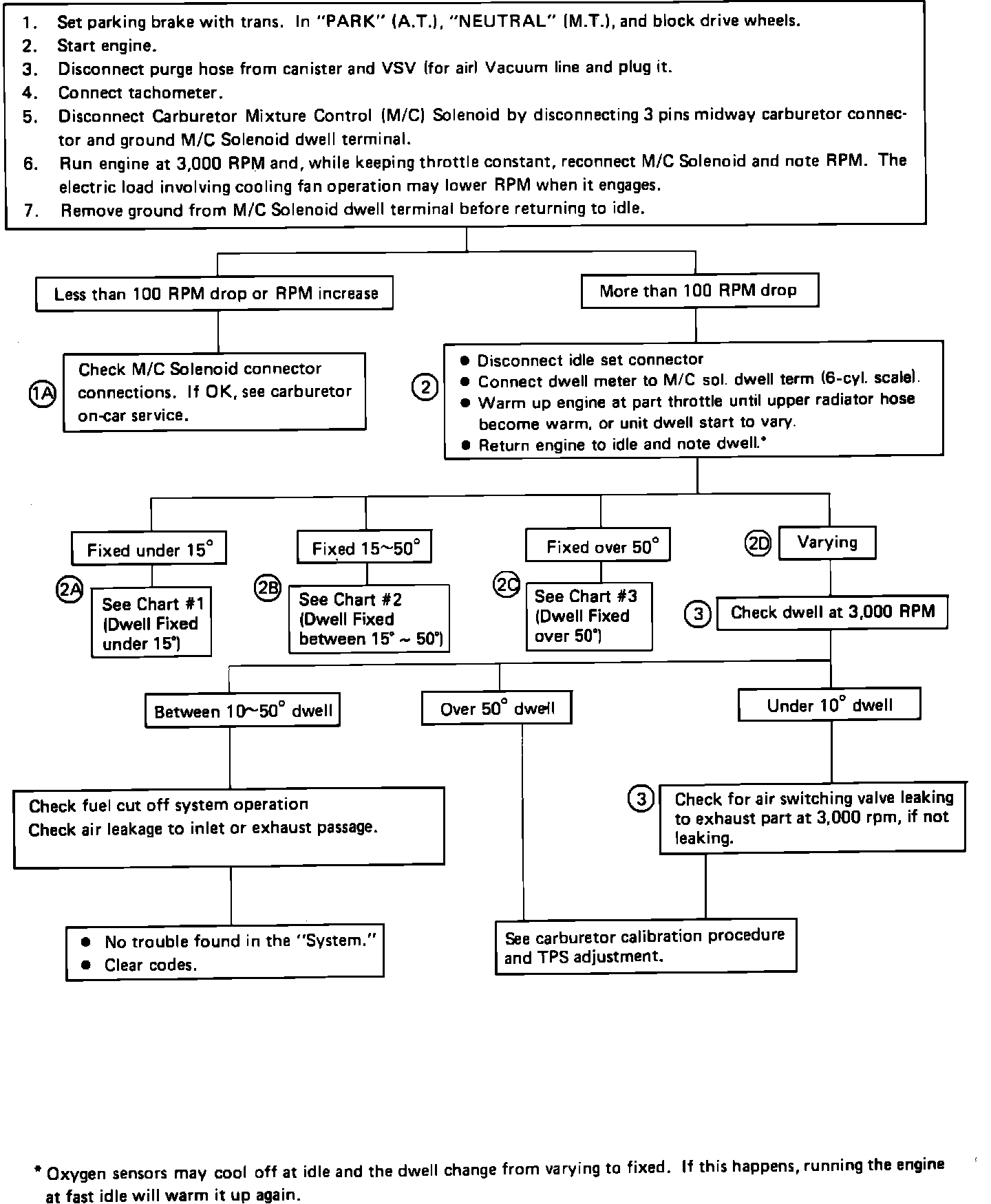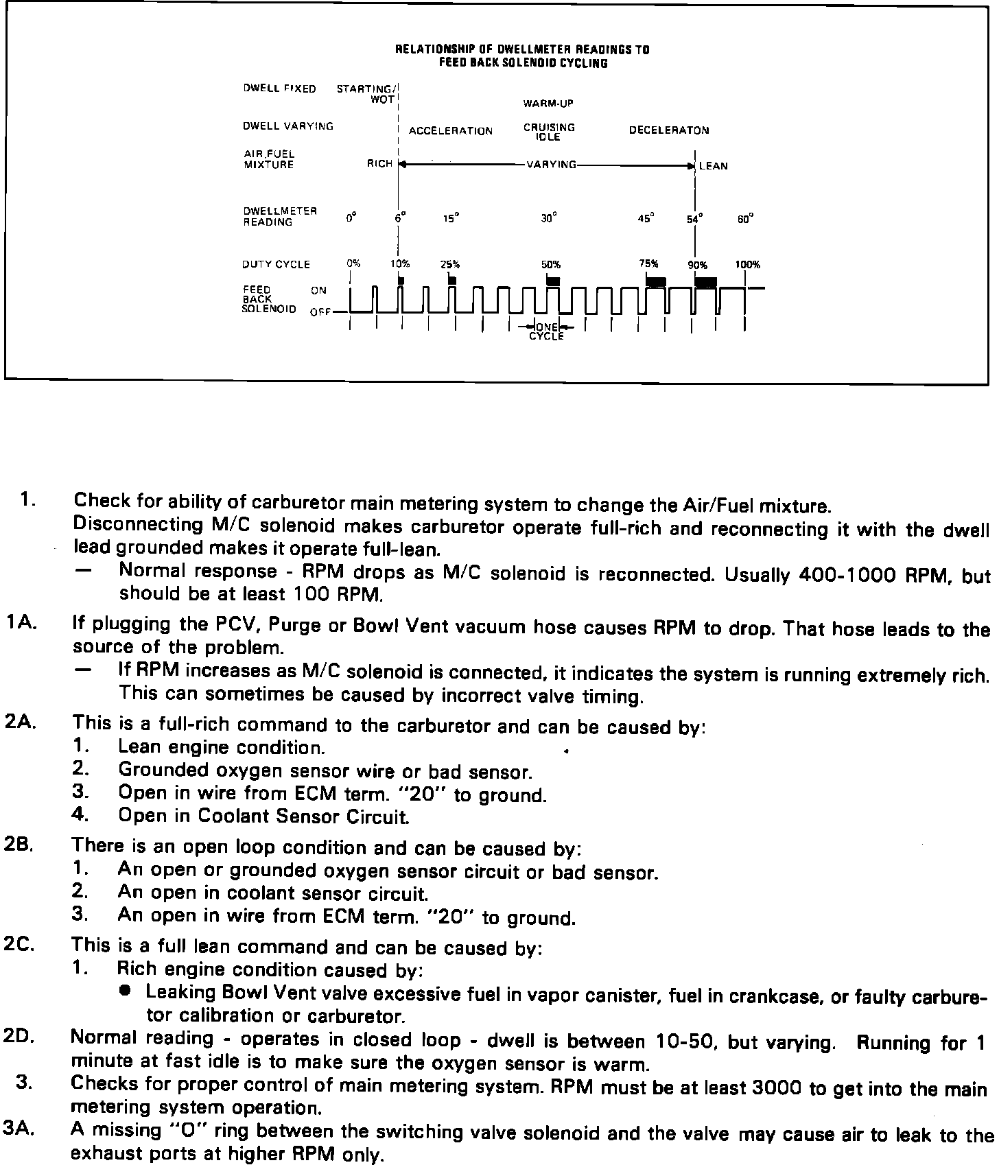 The System Performance Check is used to check the operation of the carburetor duty solenoid and main metering circuit utilizing a tachometer and to check the operation of the Closed Loop Emission Control System utilizing a dwell meter. This check is performed by following the diagnostic chart and referring to the numbered charts under DIAGNOSTIC CHARTS as needed.