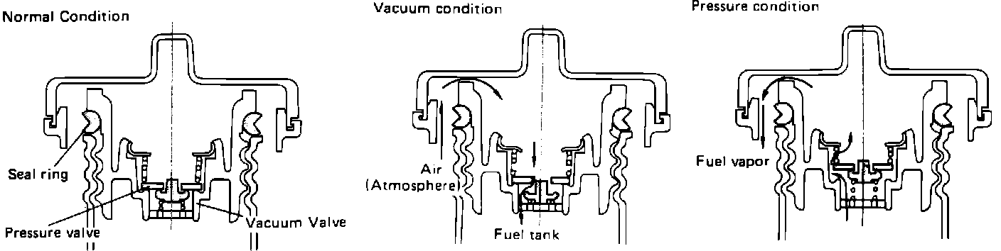 The fuel filler cap is designed with a two stage valve to prevent vapor loss. If vapor pressure within the tank is less than atmospheric the vacuum valve will open, allowing ambient air into the tank to equalize pressures. If vapor pressure in the tank exceeds a specific level, the pressure valve will open, allowing the excess fuel vapors to escape into the atmosphere. The pressure valve is a safety feature and does NOT open under normal conditions.