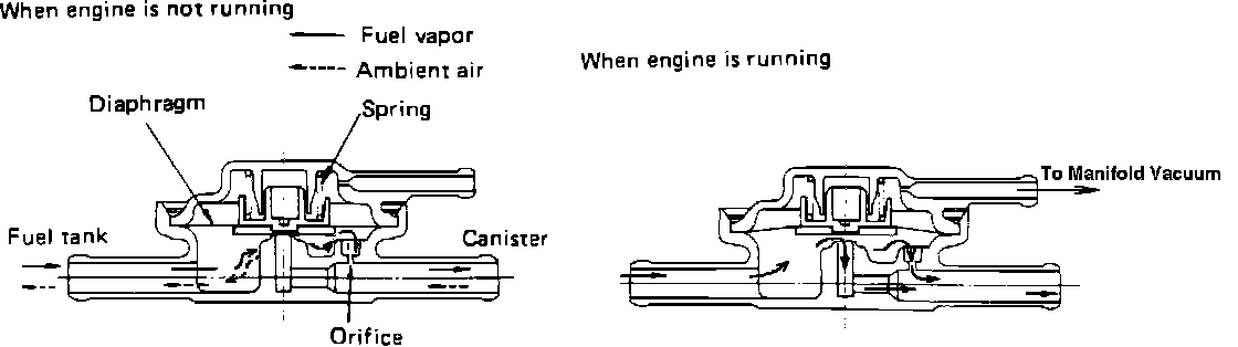 When the engine is not running, the valve is held closed by the diaphragm spring, and fuel vapor pressure is equalized through the bypass orifice. If the tank vapor pressure is greater than atmospheric, fuel vapors flow through the bypass orifice and are collected in the charcoal canister. If the tank vapor pressure is less than atmospheric, vapors and ambient air from the charcoal canister pass through the bypass orifice in the opposite direction to equalize pressures. When the engine is running and the vacuum switching valve is open, manifold vacuum opens the tank pressure control valve and fuel vapors are allowed directly into the charcoal canister where they are condensed and stored for use.