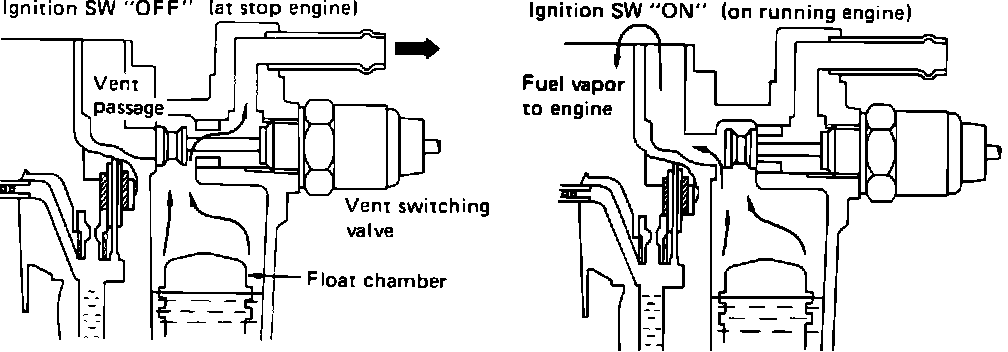 The Evaporative Control System consists of the fuel tank and filler cap, tank pressure control valve, a charcoal canister, a thermal vacuum valve, a vent switching valve (carburetor float bowl vent), a ventilation valve, and plumbing. The system collects fuel vapors from the tank and carburetor float bowl, that would otherwise be discharged into the atmosphere, and condenses them in a charcoal canister where they are temporarily stored. When the engine is started, the stored fuel and vapors are atomized with fresh air and directed to the intake to be burned in the engine. This system of vapor recovery helps not only to prevent raw hydrocarbon emissions, but also promotes fuel economy by eliminating fuel loss through evaporation.