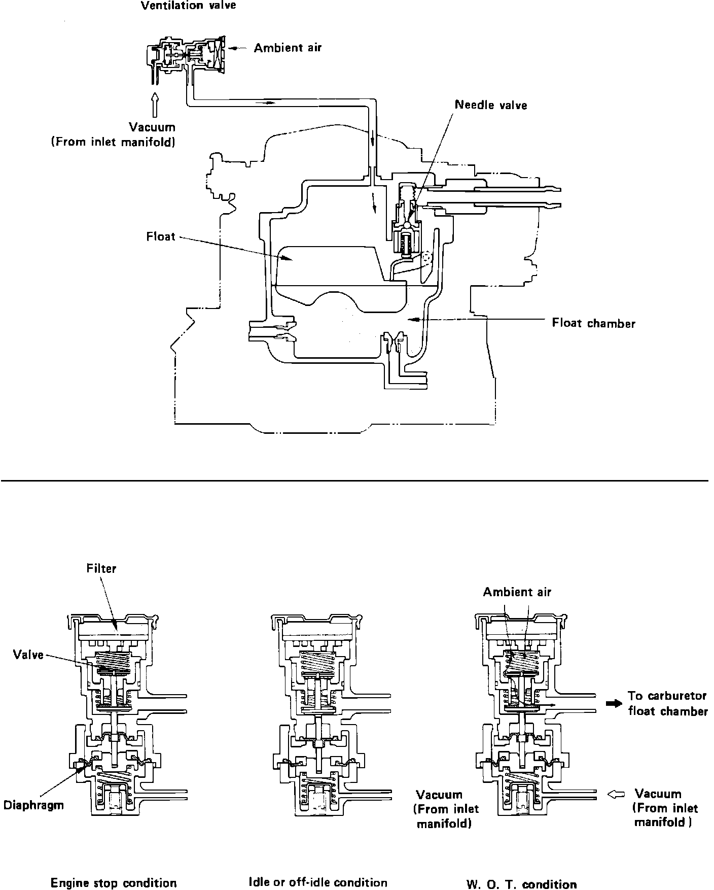 The ventilation valve is a vacuum operated valve that is used to improve hot fuel handling under wide open throttle conditions. When the engine is hot and the throttle is wide open, especially at high engine speeds, pressure in the float bowl is reduced due to the high velocity of air passing over the bowl vent. This may reduce the amount of fuel delivered through the main metering circuit. The ventilation valve opens the float bowl to ambient air, maintaining constant pressure in the float bowl for accurate fuel metering.