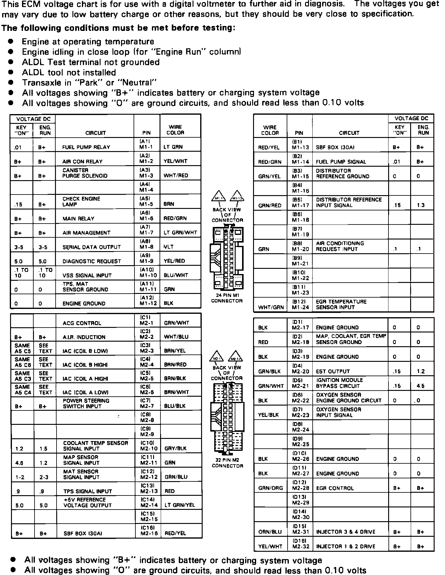 1. Check voltage at the connector terminals as listed, under the stated conditions with the ECM connected. Measure voltage with a DVOM through a "break-out box" or use a straight pin inserted from the back of the connector into the appropriate terminal.