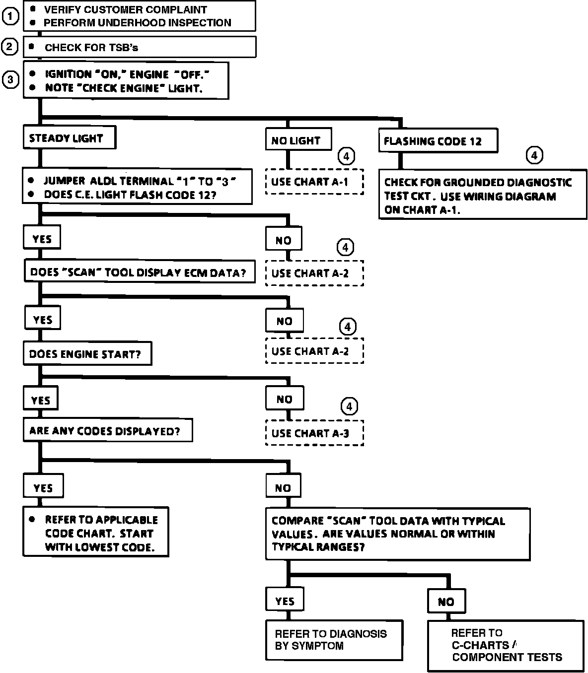b. Since this is the starting point for all diagnostic procedures or finding the cause of an emissions test failure, always begin here and always follow the flow chart as directed.