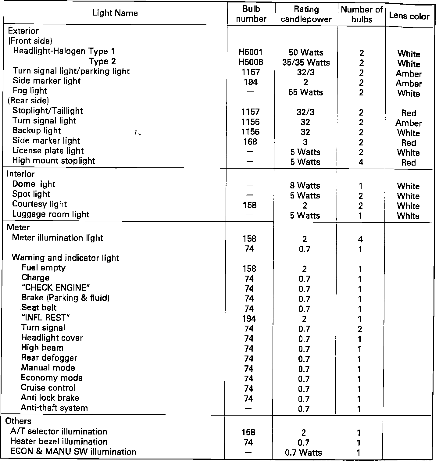 Lamp And Bulb Data: