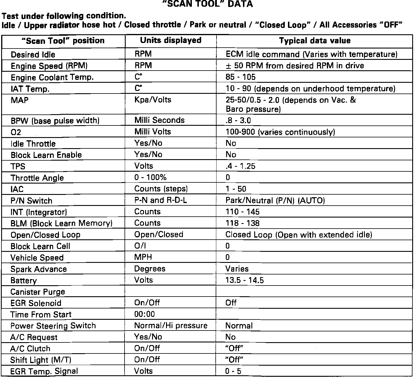 The "Scan Data" listed may be used for comparison, after completing the diagnostic circuit check and finding the on-board diagnosis system functioning properly and do diagnostic trouble codes (DTC) were displayed.