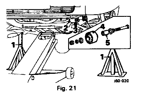 - Raise front of car by using trolley jack under suspension cross-beam, place stands (1, Fig. 21) under jacking points and lower jack to release load from bushes.