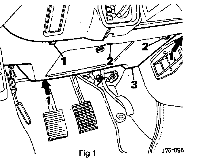 Remove the driver's side dash liner securing screws (1 Fig 1) and remove the liner (3 Fig 1).