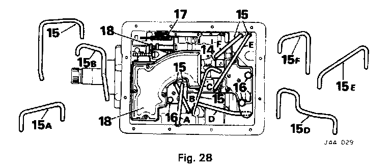 15. Note the fitted positions of the Oil tubes (Fig 28) and using a suitable screwdriver, carefully lever the tubes, with the exception of tube. 15D. out of the transmission.
