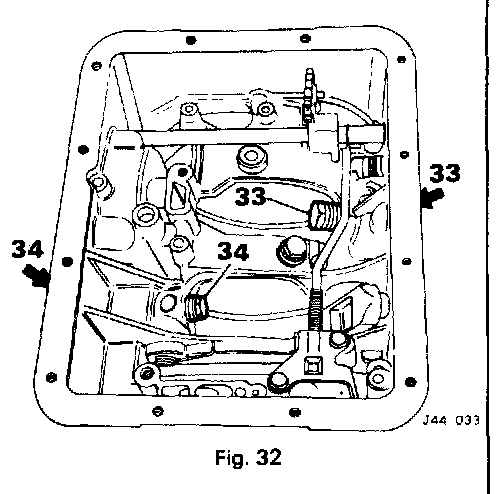 34. Slacken the locknut and unscrew the rear brake band adjuster screw; recover the brake band Strut (Fig. 32).