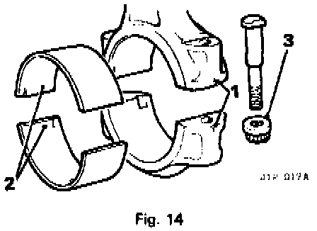 3. Remove the connecting rod cap, noting that corresponding cylinder numbers on the connecting rod and cap are on the same side (1, Fig 14).