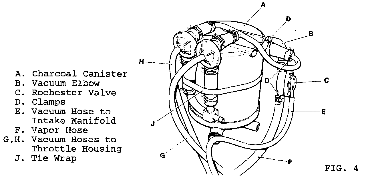 9. Fit clamps CAC 8773 (D, Fig. 4) to elbow CAC 4040/2 (B, Fig. 4). Fit one end of elbow to Rochester valve marked 'CAN' and the other to the canister stub pipe marked 'T'. Reposition the clamps to secure.