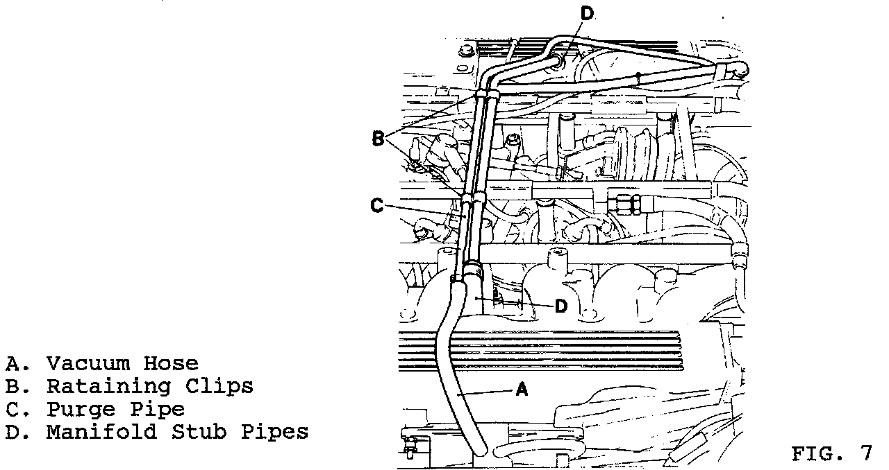 20. Disconnect the retaining clips (B, Fig. 7) securing the vacuum purge pipe to the PCV valve vacuum pipe.