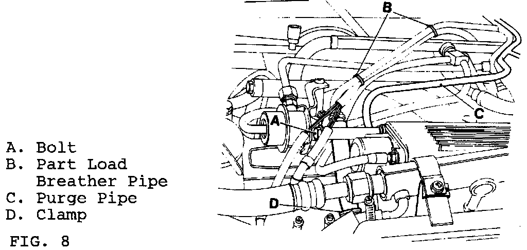 21. Remove the bolt (A, Fig. 8) securing the purge pipe to 'B' bank manifold overrun valve housing. Remove the purge pipe and existing hose assembly (C, Fig. 8).