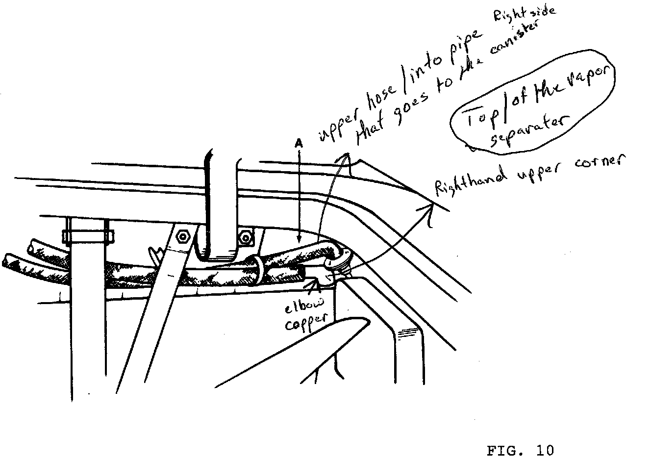 49. Remove the 2 PSI valve and associated hoses (A, Fig 10) from the vapor separator and charcoal canister pipe (located on the right side of the upper fuel tank).
