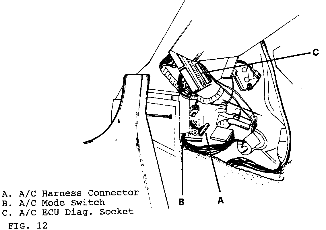 Connect the small male connector of the link harness to the air conditioning unit mode switch (B, Fig. 12). Connect the air conditioning connector to the female connector on the link harness (A, Fig. 12). Connect the remaining multi-plug connector (with two wires), to the air conditioning unit ECU Diagnostic socket (C, Fig. 12).