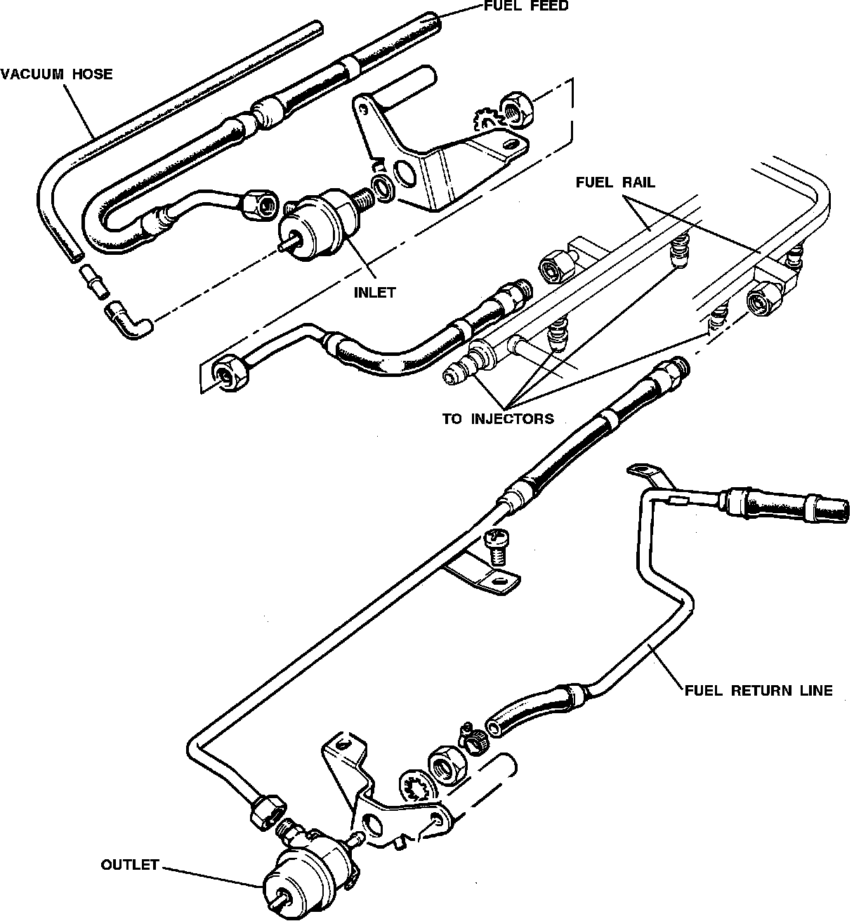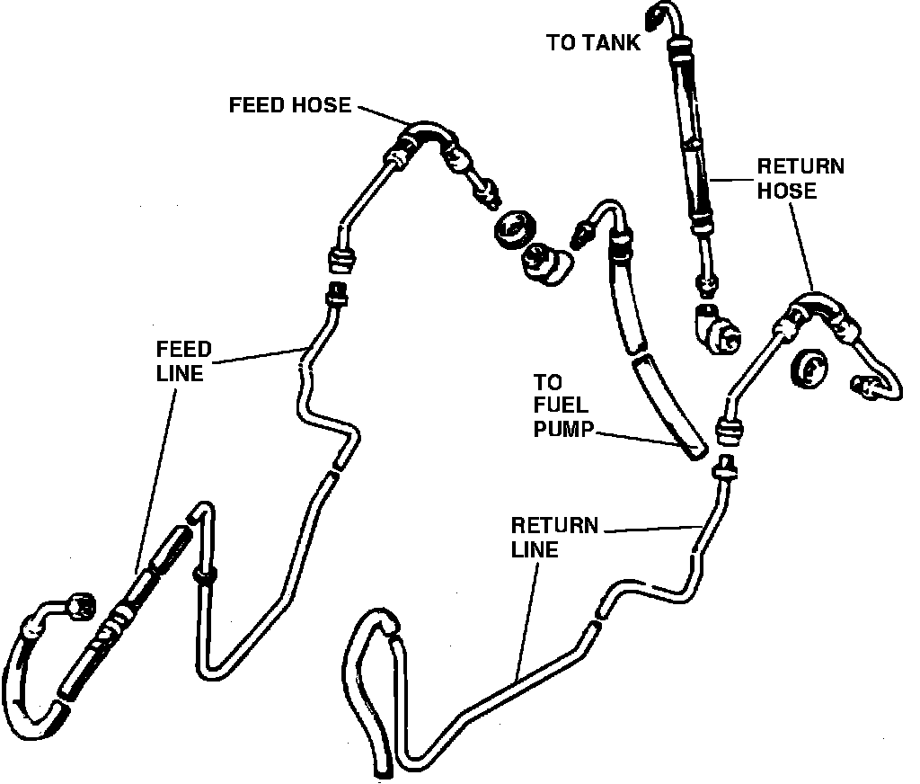 Return line is located on left underside of car. Line begins at fuel cooler and is routed from engine compartment, under body to rear of car and fuel tank.