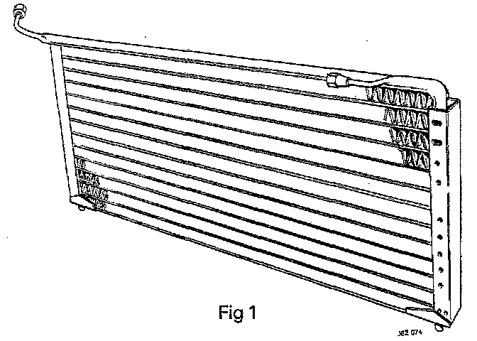 The condenser consists of a refrigerant coil mounted in a series of thin cooling fins to provide a maximum of heat transfer in the minimum amount of space. It is mounted directly in front of the car radiator so that it receives the full flow of RAM AIR. RAM AIR is the air flow induced by the forward motion of the car and the suction of the cooling fan. The condenser receives heat laden high pressure refrigerant vapor from the compressor. The refrigerant enters the inlet at the top of the condenser as a high pressure very hot vapor, and as the vapor passes down through the condenser coils, heat will follow its natural tendency and move from a hot refrigerant vapor into the cooler RAM AIR as it flows across the condenser coil fins. When refrigerant vapor reaches the temperature and pressure that will induce a change of state, a large quantity of heat will be transferred to the outside air and the refrigerant will change from high pressure hot vapor to a high pressure warm liquid.