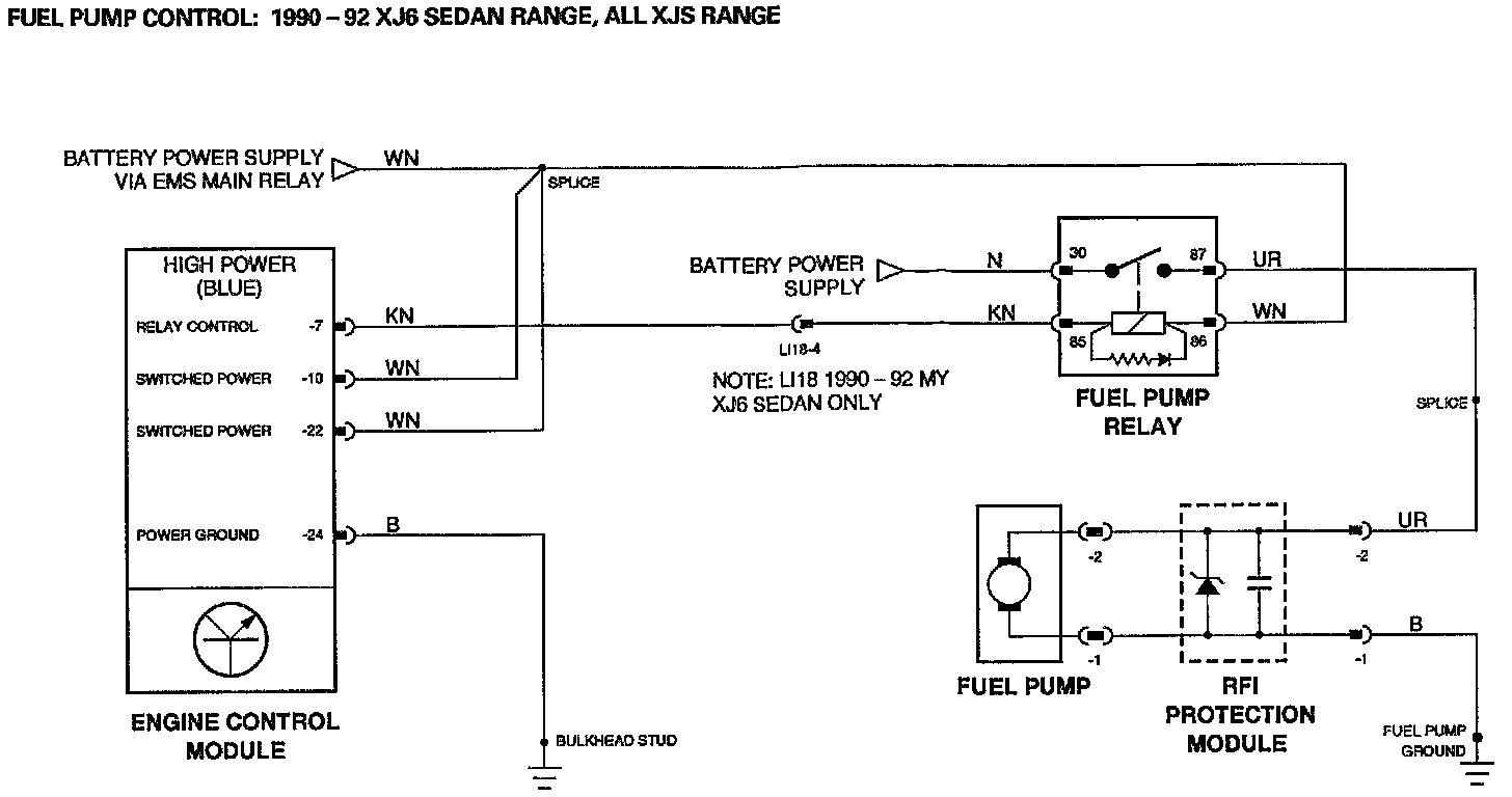 - Short circuit or open circuit wiring from the ECM to the fuel pump relay (all XJS and 1990 - 92 MY XJ6).