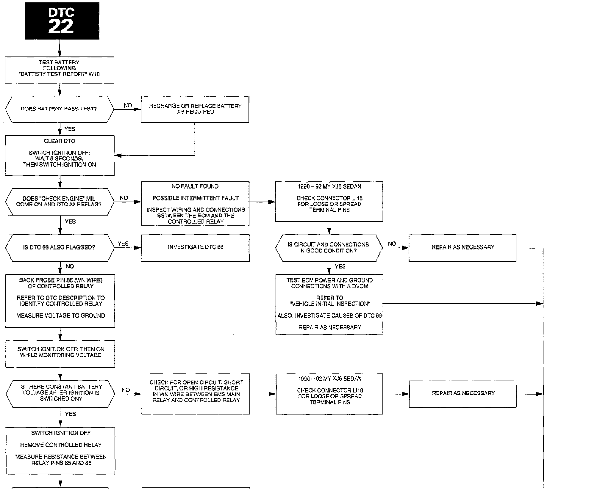 The ECM will flag DTC 22 if the fuel pump control circuit is open or short circuit while the fuel pump is operating.