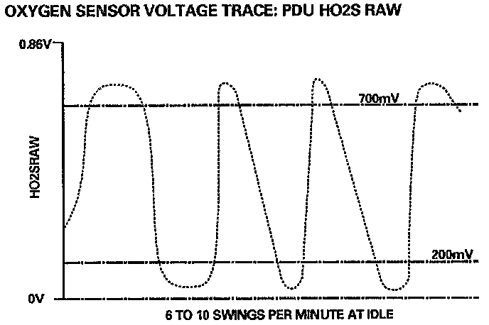 5. During closed loop fueling, the oxygen sensor "raw" voltage (signal voltage to the ECM) normally swings between 0.2 and 0.8 volt. If the oxygen sensor becomes contaminated or the heater is inoperative, the sensor can be "lazy" A lazy sensor may show a voltage swing of 0.3-0.7 volt or even less. The oxygen sensor raw voltage can be monitored using PDU (H02 S RAW).